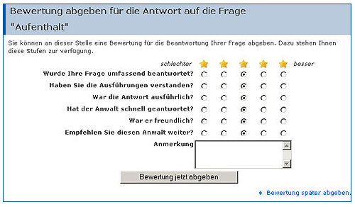 Die Online-Rechtsberatung stellt eine sinnvolle, schnelle und bequeme Ergänzung des herkömmlichen Kanzleibesuches dar, wenn es darum geht alltägliche Rechtsfragen zu beantworten. Um die Qualität dieser Beratung zu optimieren haben wir ein Bewertungssystem eingeführt, mit dem Sie die Ihnen erteilte Antwort auf Ihre Frage wie folgt bewerten können: